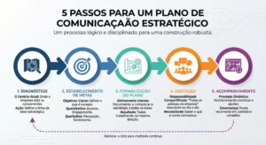 investir em comunicação estratégica. Isso não é luxo, é mecanismo de proteção e alavanca de crescimento. Alguns passos práticos: Diagnósticos, estabelecimento de metas, formalização de planos, execução compartilhada e acompanhamento contínuo conforme quadro